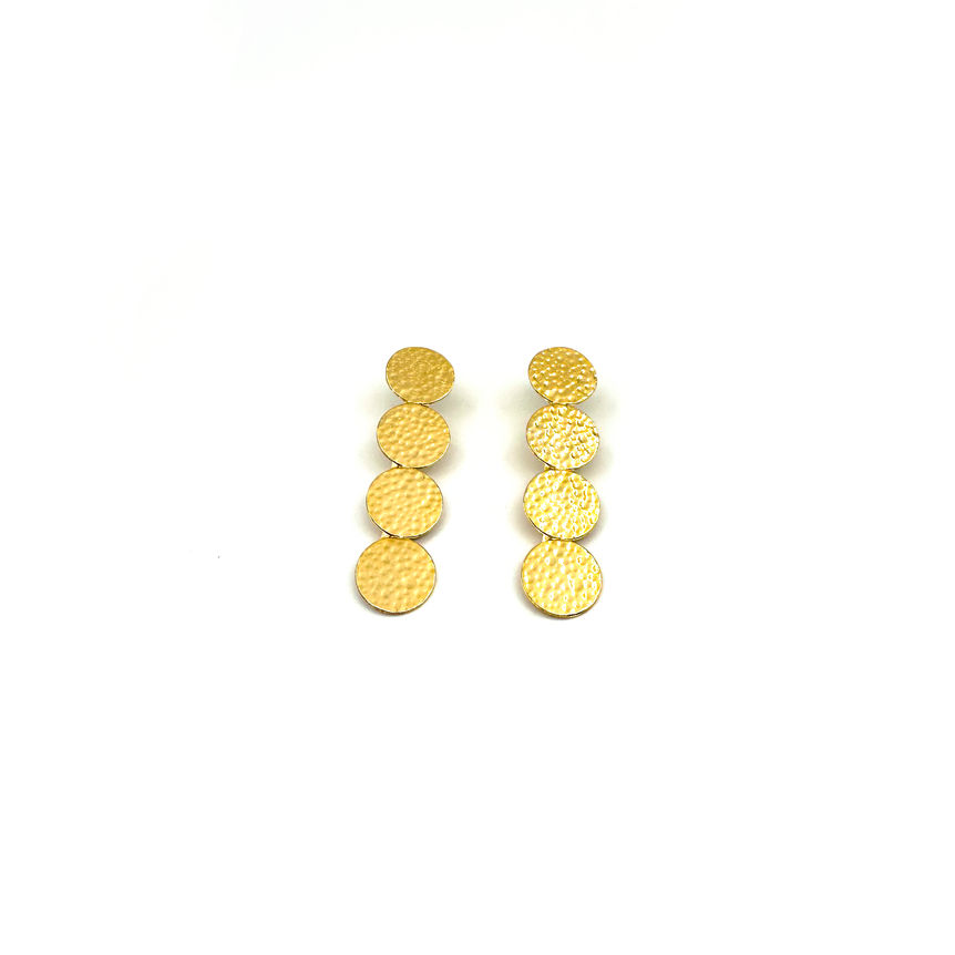 Modern ve zamansız bir şıklık sunan bu küpe, dört adet yuvarlak formun sıralanmasıyla tasarlandı. Mat ve çekiçlenmiş yüzeyi sayesinde ışığı zarifçe yansıtır ve her kombinize farklı bir dokunuş katar.